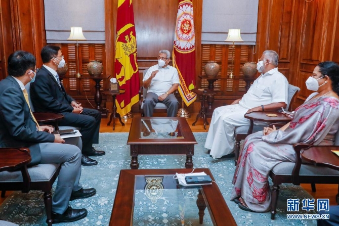 7月27日,斯里兰卡总统戈塔巴雅(中)在科伦坡总统府会见中国驻斯里兰卡大使戚振宏(左二)。新华社发(斯里兰卡总统府媒体处供图)