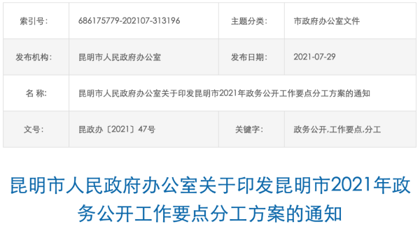 7月29日,市政府官网发布《昆明市2021年政务公开工作要点分工方案》,明确了81项工作的具体要求、牵头落实单位及完成时限。其中,“进行推进财政领域信息公开”“推进市场监管领域信息公开”“推进重点领域统计数据公开”“加强重要政策发布解读”等工作任务中的具体分项须在10月31前完成。