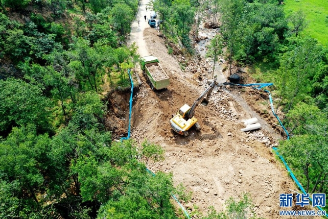 7月28日,河南省淇县,工程机械车辆正在对山区水毁路段进行抢修。