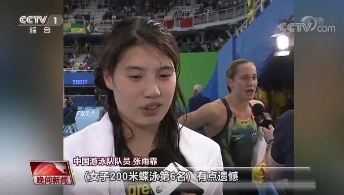 中国游泳队队员 张雨霏:(女子200米蝶泳第6名)有点遗憾,下次我会更努力的。我总觉得有点对不起自己的教练还有那么多观众的期望。