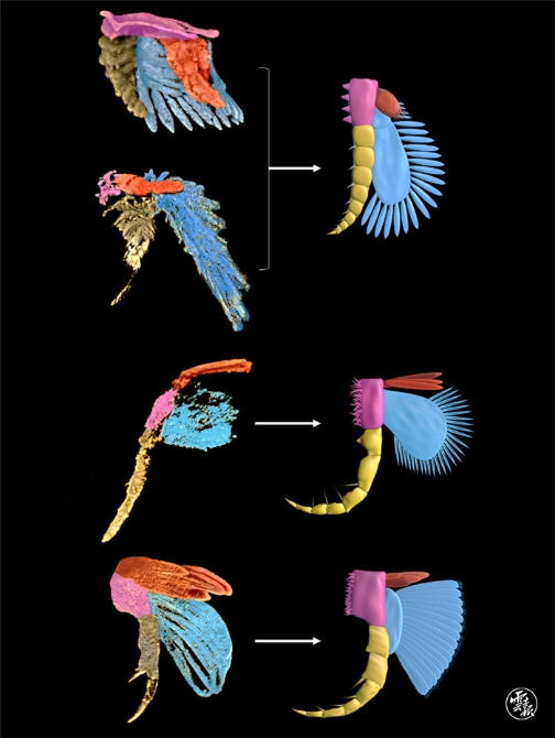 该研究借助国际前沿的显微CT扫描技术和计算机三维复原技术,揭示了距今5.18亿年的云南澄江生物群中若干节肢动物双支型腿肢基部的新结构,即上肢。