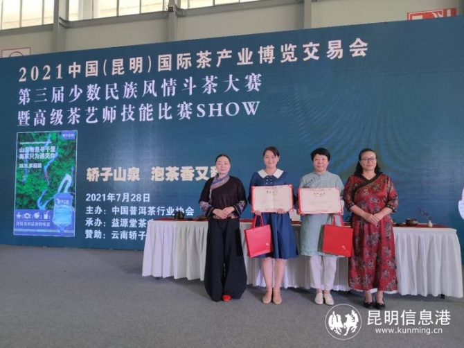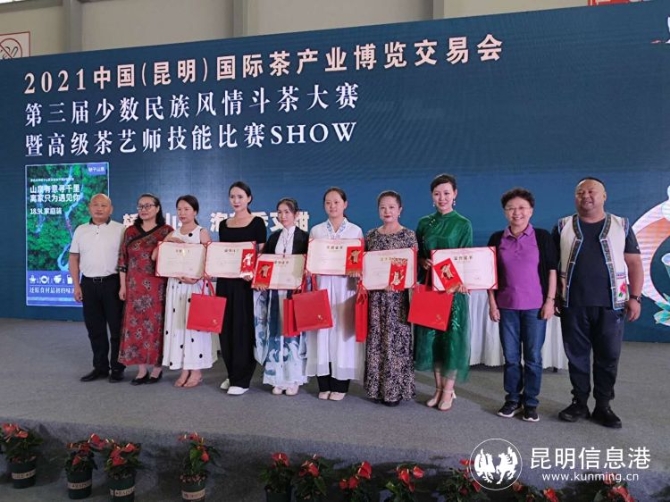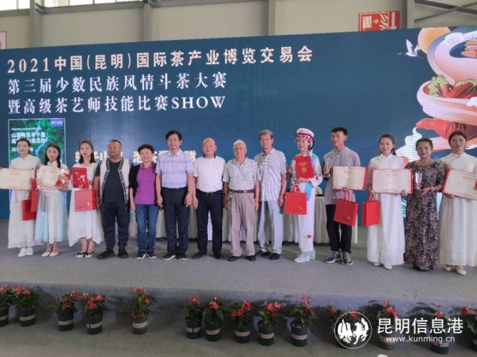 昆明信息港讯 记者杨雁 8月1日,2021中国昆明(国际)茶产业博览交易会第三届少数民族风情斗茶大赛暨民族茶艺师大赛颁奖仪式在昆明会展中心5号馆举行。本次颁奖是针对7月28日起在昆明益源堂茶疗养生主题会馆近2天的斗茶大赛中,由云南茶界权威专家评审团经过严谨审评,对参赛茶企高品质茶品以及个人精湛茶艺的肯定,现场颁出各大金奖茶企及个人一二等金奖等奖项。通过本次大赛,助推云茶走向全国,把健康好茶带给世界。