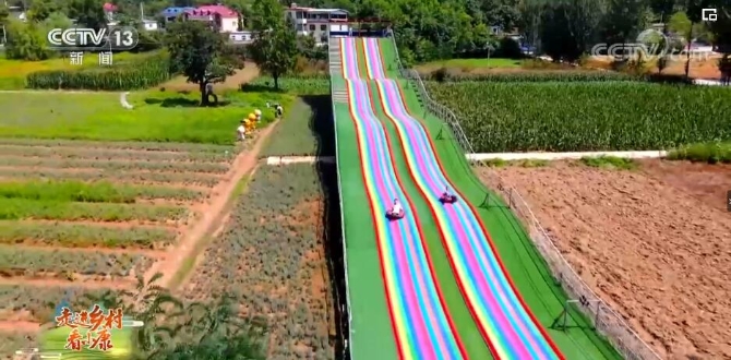 甘肃陇南市成县陈院镇副镇长 李小凤:这是咱们的一个网红打卡基地,平时咱们周边的群众以及县城的群众会过来旅游观光拍照打卡,以及体验咱们的村集体项目彩虹滑道。这个彩虹滑道自5月1日营业以来,两个多月的时间,它的营业收入已经达到了7万余元。