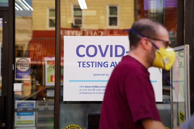 7月26日,行人从美国纽约一家药店的新冠检测广告牌旁走过。据美国有线电视新闻网报道,当前疫情模型数据显示,如果疫苗接种率不能提高,美国面临的最坏情况将是每日新增新冠死亡病例4000例。(新华社记者王迎摄)
