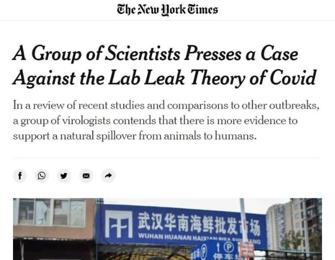 柯文思提到的这篇报道,题为“多名科学家反驳(新冠病毒)实验室泄漏论”(A Group of Scientists Presses a Case Against the Lab Leak Theory of Covid),由《纽约时报》专栏作者卡尔·齐默和科普作者詹姆斯·戈曼共同撰写。该报道在纽约时报网站上首发于7月9日,7月22日有内容更新。报道援引21名权威病毒学家最新发表的一份联名报告说,最可能导致新冠病毒大流行的原因,是从动物到人类的“自然溢出”,而不是所谓“实验室泄漏”。由于“新冠病毒源于自然”的证据越来越多,就连以前对此持怀疑态度的科学家也开始“倒戈”,明确反对某些西方政客制造的“阴谋论”。