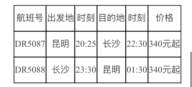 “昆明=长沙”航班班期计划为每周一、三、五、七执飞,航班信息及优惠价格如下: