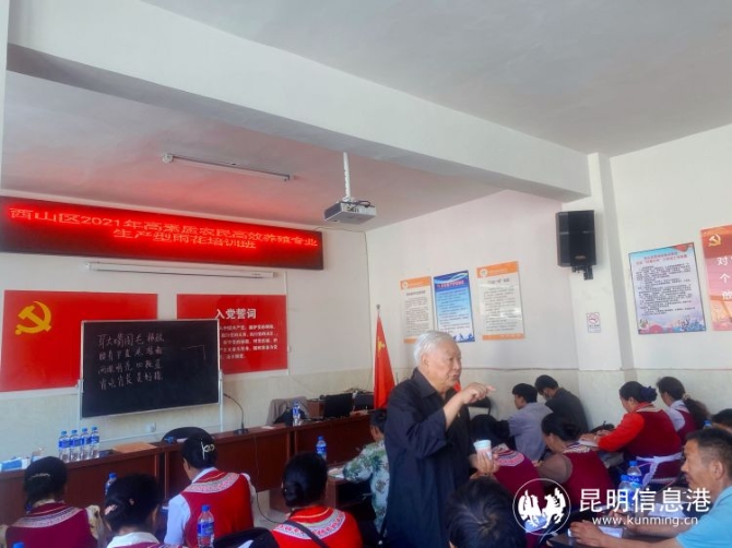 昆明信息港讯 实习记者杞青蓉 “这个养好猪到底是怎么养?两眼明亮四腿直,肯吃肯长是好猪。”随着讲课的声音传来,课桌前,村民们手拿笔记本认真听讲,吸引他们聚到一起的,是一场“新农人”培训。日前,西山区团结街道永靖社区、雨花社区开展2021年高素质农民培育高效养殖专业生产型培训班,专门邀请农业专家,围绕蔬菜水果害虫绿色防控技术、牲畜养殖护理等开展培训。