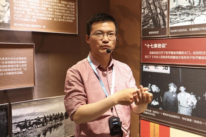 (张庆冲正在讲解进藏解放军的故事 央视网记者 王静远 摄)