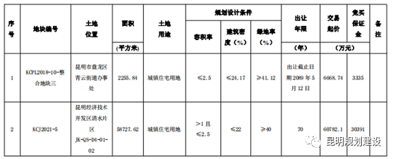 8月4日,盘龙区青云街道办事处编号为KCPL2018-10-整合地块三和经济技术开发区清水片区编号为KCJ2021-5的地块在昆明市公共资源交易中心挂牌,将于9月3日进行拍卖。