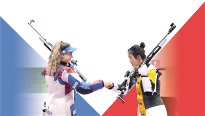7月24日,中国射击选手杨倩(右)在赛后和获得亚军的阿纳斯塔西娅致意。