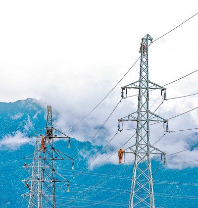 工人在527国道沿线架设线路。潘伟峰摄(影像中国)