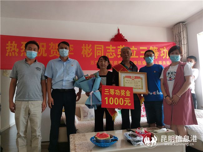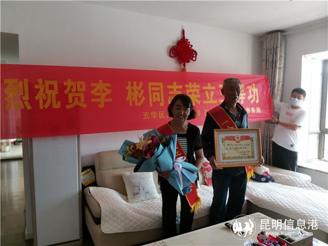 昆明信息港讯 记者昝娟娟 8月5日,五华区人民武装部、退役军人事务局、黑林铺街道办事处和国际花园社区居委会相关领导以及工作人员来到中天花园小区,为辖区现役军人李彬家送去立功喜报。