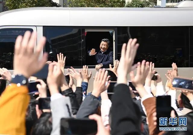 2021年3月22日至25日,习近平在福建考察。这是25日上午,习近平在福州闽江学院考察时,向师生们挥手致意。 图源:新华社