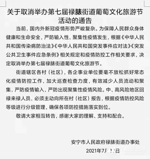 昆明信息港讯 记者杨雁 原定于本周末启幕的安宁禄脿街道人气活动——第七届葡萄文化旅游节暨葡萄展销会,因疫情防控工作相关要求决定取消。虽然盛会不能举办,不过当下,安宁禄脿街道的葡萄已大面积成熟了,预计今年禄脿葡萄产量将达4400吨。