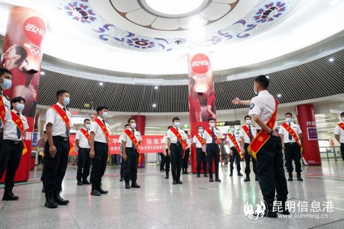 昆明信息港讯 记者杨雨 8月6日上午10点整,在东风广场地铁站站厅里,一场精彩的文明礼仪展示拉开了文明礼仪教育引导活动的序幕。着整齐工装的工作人员现场演示了文明规范的岗位作业标准,排队候车三部曲及“您好、请、谢谢、对不起、再见”十字文明用语,吸引了过往乘客的驻足围观。
