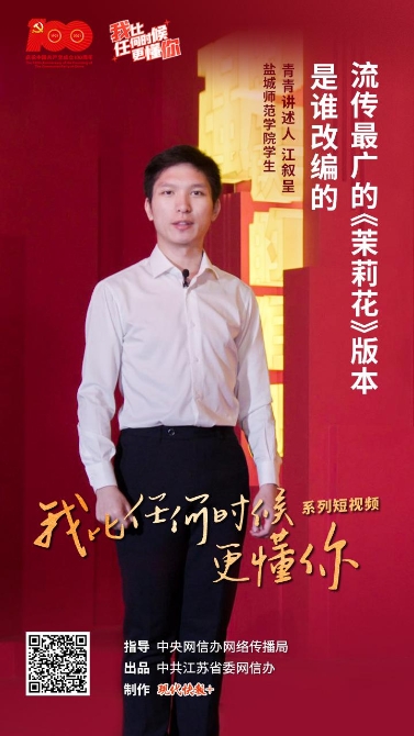 1941 年 1 月," 皖南事变 " 后,中国共产党对国民党这一反动暴行进行了针锋相对的斗争。1 月 20 日,中共中央革命军事委员会发布重建新四军军部的命令,新四军军部在盐城重建。在党的领导下,新四军独立自主地开展大江南北的敌后抗战,成为华中抗战的主要力量。江苏民歌《茉莉花》最初绽放在战争的焦土上,由新四军战士何仿改编而成。当时年仅 14 岁的文化战士何仿一手持枪,一手握笔,改编出最 " 出圈 " 的《茉莉花》。《茉莉花》在炮火硝烟中绽放,新四军将士用鲜血和生命铸就了新四军铁的精神。" 如今生活在和平年代的我们,或许再难接触到先辈们曾经历过的苦难。但看到一件件抗战文物,还有无数革命先烈的姓名,我好像看到了他们当年保家卫国的画面 ……" 江叙呈说,作为一名传媒专业的学生,他在这次拍摄中感受到了自己专业学习的意义。" 讲好英雄故事、传承红色精神,我真正感受到了自己所学所言的意义所在。"