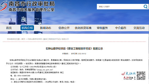 据了解,这两所学校项目的规划、建筑设计方案经中介机构技术审查合格,能满足规划要求。根据《江西省城乡规划条例》等法规要求,南昌市行政审批局对这两所学校项目规划方案予以批前公示。如无异议,将依据建设单位的申请核发《建设工程规划许可证》。(记者徐立鸣)