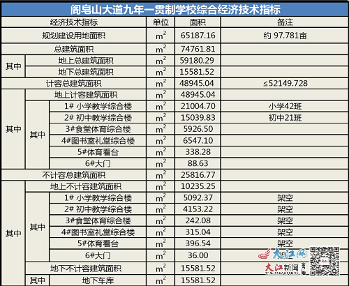 阁皂山大道九年一贯制学校综合经济技术指标