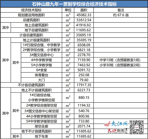 石钟山路九年一贯制学校综合经济技术指标显示,该校规划建设用地面积45082.33平方米,约67.6亩,总建筑面积53612.54平方米,规划小学30班,初中15班。