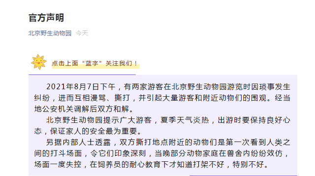 8月7日,有两家游客在北京野生动物园游览时因琐事发生纠纷,进而互相漫骂、撕打,并引起大量游客和附近动物们的围观。经当地公安机关调解后双方和解。