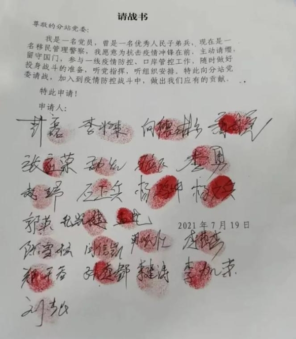 民警张崇魁在请战书中写道:“在疫情防控的关键时刻,我主动申请参与边境一线的疫情防控,到抵边一线去,真正做到守土有责、守土负责、守土尽责……”