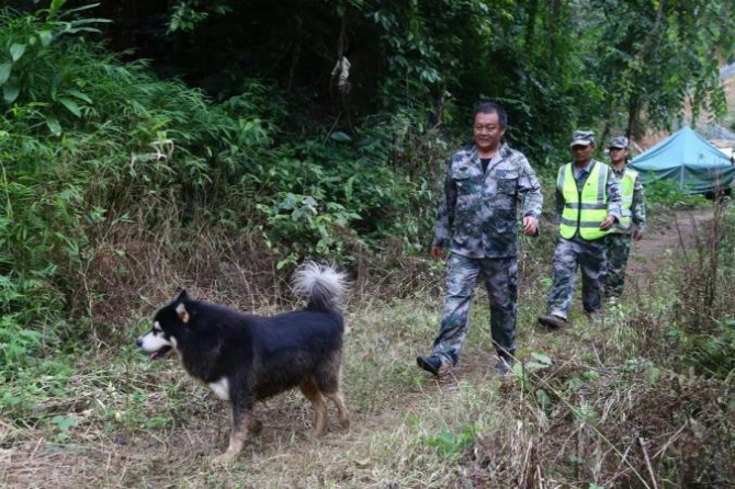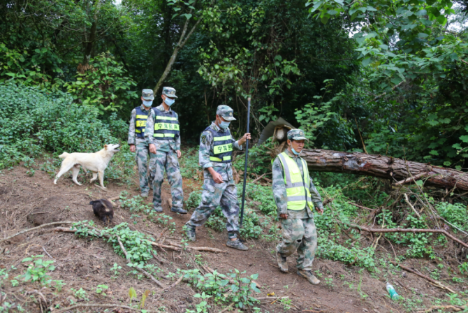谢佳学带着他的狗狗,走在巡逻队伍最前面。