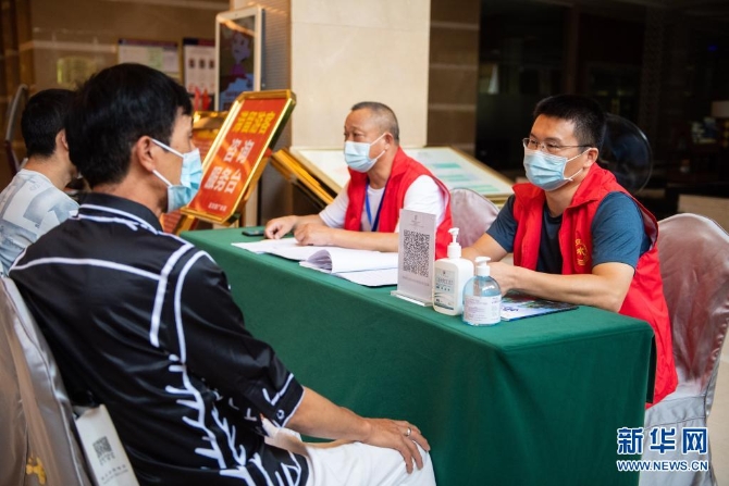 8月8日,在张家界青河锦江国际酒店大堂,翟勇彬(右一)协助登记滞留游客信息。(新华社记者 陈思汗 摄)