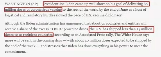 △美联社:拜登政府原本承诺到6月底之前向其他国家提供8000万剂疫苗,而实际只向外运送了不足2400万剂。