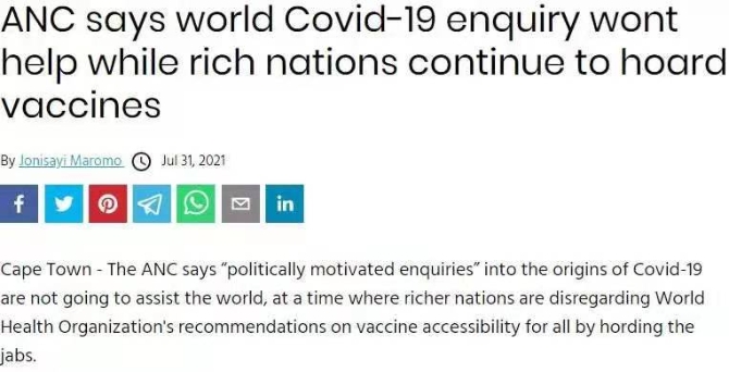 南非执政党非洲人国民大会(非国大)近期发表声明指出,新冠肺炎疫情已经导致世界各地数百万人死亡,“在这个富裕国家无视世卫组织的分享疫苗建议而独享大量疫苗的时候,就新冠病毒的起源进行出于政治动机的调查对世界毫无帮助”。