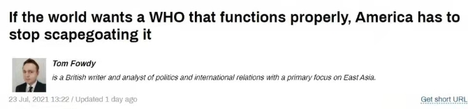 英国作家、政治和国际关系分析人士汤姆·福迪在“今日俄罗斯”新闻网发文指出,美国现政府仍然延续了前政府编造“实验室泄漏”谎言和病毒溯源阴谋论的行径,试图让疫情和世卫组织都走向“政治化”。“如果想要世卫组织正常运行,美国就必须停止让该组织充当替罪羊”。