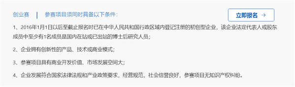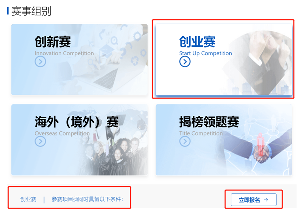 第三步:很重要!!!找到“赛事组别”,点击选中拟报名参赛的组别(创新赛、创业赛、海外(境外)赛、揭榜领题赛)后,点击“立即报名”按钮(注:务必先选中拟报名组别后再进行下一步,系统将默认注册用户为相关组别参赛人员)。例如:参加“创业赛”需满足“2016年1月1日以后至截止报名时已在中华人民共和国行政区域内登记注册的初创型企业,该企业法定代表人或股东成员中至少有1名成员是国内在站或已出站的博士后研究人员”等条件。