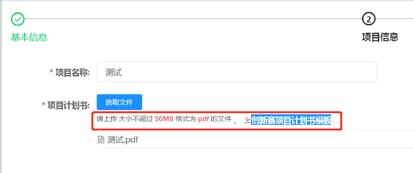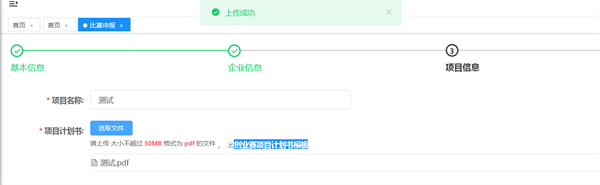 第九步:上传项目计划书,其中,《2021年全国博士后创新创业大赛项目计划书模板》可下载填写。