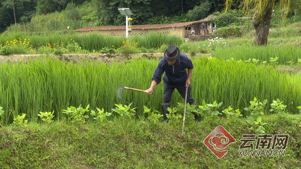 张正明是大鱼塘村的另一名“赶沟人”,无论是梯田的蓄水期,抑或秧苗的生长期,都是他最忙碌的时候。他主要负责沟渠的日常管护,常常需要带着锄头和镰刀去疏通沟渠,保证沟水能不间断地流进各家的田块。