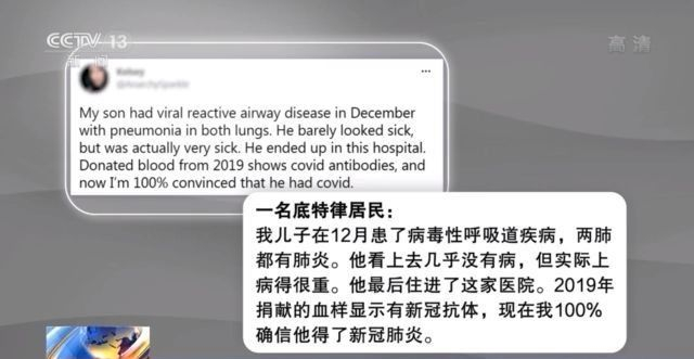 一位来自底特律的居民在社交媒体确认,他的儿子在2020年12月患了病毒性呼吸道疾病,两肺都有肺炎。而且2019年他儿子捐献的血样显示有新冠抗体,因此他100%确信儿子当时得了新冠肺炎。