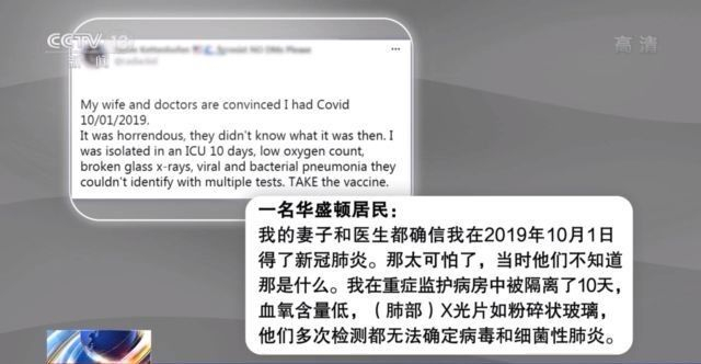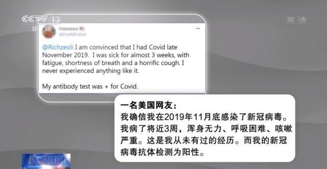 一位美国网友则表示,他在确信自己在2019年11月底就感染了新冠病毒。他在社交媒体发文说,“我病了将近3周,浑身无力、呼吸困难、咳嗽严重。这是我从未有过的经历。而我的新冠病毒抗体检测为阳性。”
