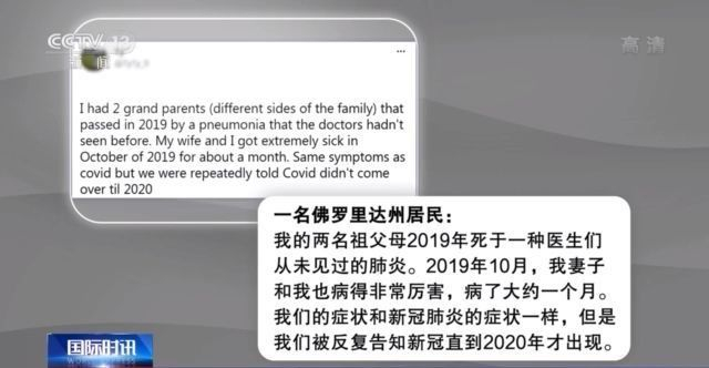 一名来自佛罗里达州的用户则写道,“我的两名祖父母2019年死于一种医生们从未见过的肺炎。2019年10月,我妻子和我也病得非常厉害,病了大约一个月。我们的症状和新冠肺炎的症状一样,但是我们被反复告知新冠直到2020年才出现。”