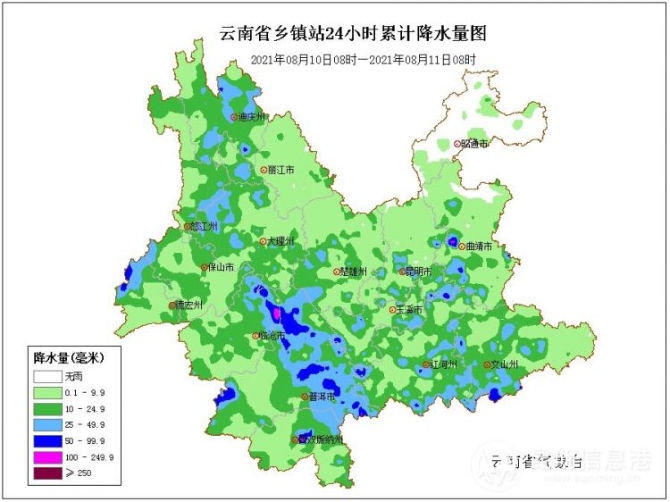8月11日德宏、保山南部、临沧西部、普洱西部阴有大到暴雨局部大暴雨,怒江、保山北部、临沧东部、普洱东部、西双版纳、红河南部、文山西南部阴有中到大雨局部暴雨,其它地区多云间阴有小到中雨。