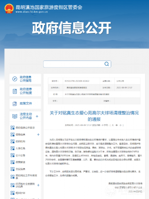 昆明信息港讯 记者杨雁 记者从昆明滇池国家旅游度假区获悉,8月9日,昆明滇池国家旅游度假区高尔夫球场综合清理整治领导小组办公室发出《关于对铭真生态爱心苑高尔夫球场清理整治情况的通报》。该《通报》称,目前已彻底铲除原铭真生态爱心苑高尔夫球场18个球洞及全部球场设施,完成该区域的生态绿化修复,全面去化高尔夫球场功能和形态。
