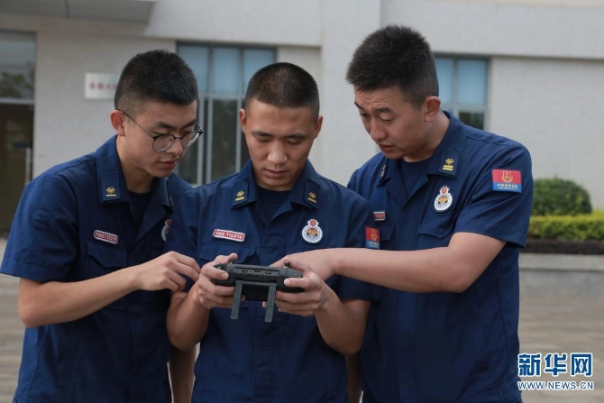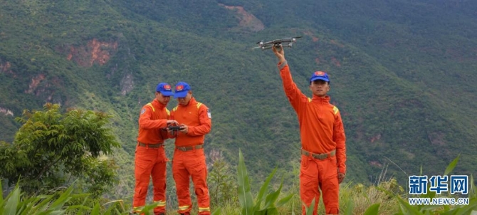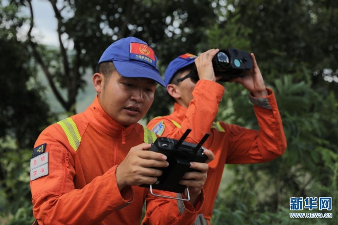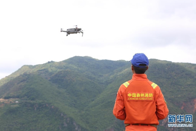 队员正在操纵起飞无人机(摄于7月17日)。新华网发(云南省森林消防总队供图)