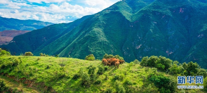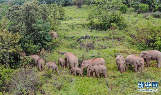 无人机拍摄到的北移亚洲象(摄于7月21日)。新华网发(云南省森林消防总队供图)