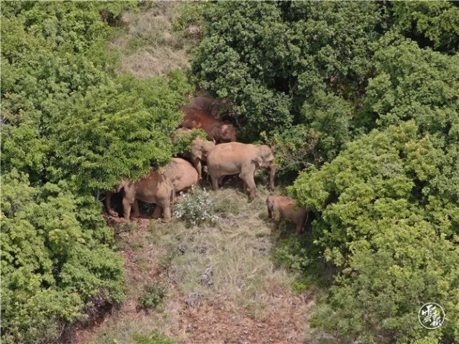 8月7日,北移亚洲象群仍在玉溪市元江县甘庄街道附近林地内活动。