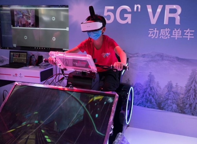 在2021中国国际大数据产业博览会展馆,观众体验5G虚拟现实动感单车。新华社记者 金立旺摄