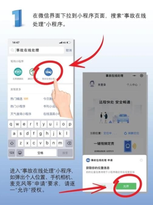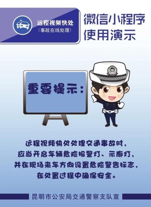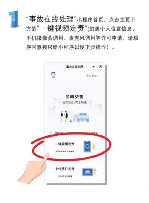 昆明市公安局交通警察支队交通事故处理大队民警张勇介绍,“当事人只需打开手机中的微信小程序‘事故在线处理’,点击‘一键视频定责’,小程序便会自动接通事故发生地的交警大队接警指挥处,随后在接警人员的引导下,对事故现场进行录制、拍摄,待接警人员截取相关证据图片后,即可撤离现场。”