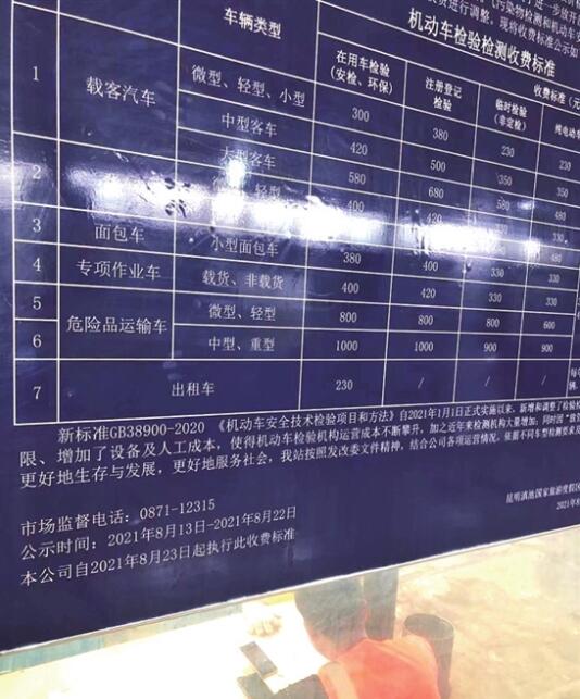 17日,有市民在网上爆料称——“机动车检测费要涨价了”,同时还配发了一张昆明市第五机动车安全检车站公示的收费标准。从图片上看,公示时间为2021年8月16日至8月24日,8月25日起执行。其中,小型汽车燃油类的检测费将调整为320元、纯电类调整为240元。