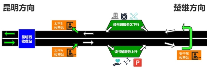 读书铺服务区实现U转通行后,居住在昆明市区和太平的司乘人员到读书铺服务区游玩后,无需再到安宁东收费站下高速即可快速返程。经测算,目前昆明市区、太平去往读书铺服务区游玩车辆通过U转通道返程,行驶里程可减少7.81km、通行费支出减少3.9元、节约用时约10分钟。此举不仅有效缓解了安宁东收费站通行压力、减少拥堵,更为广大驾乘人员节省了时间成本、燃油成本和通行费用,对节能降耗和提升通行效率有极大促进作用。