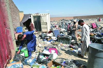 7月3日,在阿富汗帕尔万省的巴格拉姆空军基地附近,当地居民在美军遗留的物品中回收废旧物。新华社发