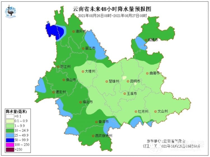 据悉,预计25日滇西北北部、滇西边缘、滇西南西部、滇东南边缘及滇东北北部有大雨局部暴雨。26日怒江北部阴有暴雨局部大暴雨,迪庆西部、丽江东部、德宏西部、保山西部、临沧西部、普洱南部、西双版纳西部、红河南部、昭通南部、曲靖北部阴有中到大雨,其它地区多云有阵雨局部中雨。滇西北、滇西、滇西南、滇中北部、滇东北有雷暴、局地短时强降水、大风等强对流天气。