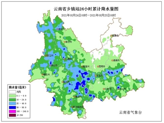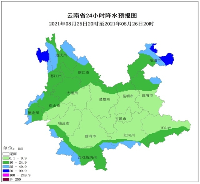 8月25日20时到8月26日20时:昭通北部、丽江北部、迪庆、怒江北部阴有中到大雨局部暴雨,昭通南部、曲靖北部、丽江南部、怒江南部、保山北部、德宏、临沧南部、普洱南部、西双版纳、红河南部多云有小到中雨局部大雨,其他地区多云有阵雨。