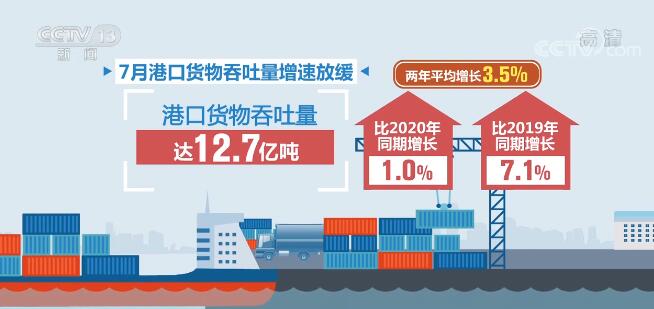 7月,我国港口货物吞吐量达12.7亿吨,比2020年同期增长1.0%,比2019年同期增长7.1%,两年平均增长3.5%。