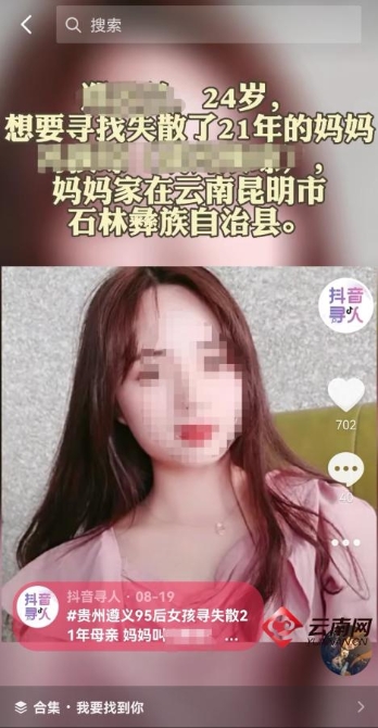 接到求助后,抖音寻人当日制作了方晓月寻母的视频并发布,定向推送至冯丽英的家乡云南省昆明市石林县。很快,云南当地的几位寻人志愿者联系上冯丽英的亲弟弟,拿到冯丽英的电话,反馈给了抖音寻人。